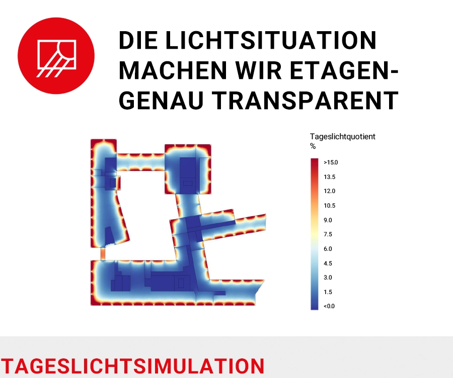 Auf Grundlage unserer Modellszenarien rücken Entscheidungen noch näher an den Bauherrn, den Planer und nicht zuletzt den Nutzer von Immobilien. Unterschiedliche Licht-, Luft- und Klimabedingungen übertragen wir in dazu passende technische Maßnahmen und geben konkrete, bautaugliche Empfehlungen. Kurz: wir optimieren das Konzept für mehr Nachhaltigkeit und Komfort, Sicherheit und Effizienz.